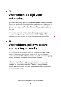 We laten ons in Groningen niet dwingen om snel en gehaast plannen op tafel te gooien. Het is niet de bedoeling om begrotingsgaten van instanties en overheden te vullen. We nemen met elkaar en gelijkwaardig de tijd voor goede visievorming aan de hand van bovenstaande leidende principes; voor en door Groningers. En met gelijkwaardig bedoelen we niet alleen dat we als Gasberaad en vertegenwoordigers uit bijvoorbeeld de zorg en het onderwijs meepraten, maar ook dat onze adviezen serieus genomen worden.