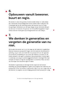We denken in deze drie groottes. Ze beïnvloeden elkaar en vullen elkaar aan. Vanuit elke perspectiefgrootte kunnen andere zaken nodig zijn. Het is belangrijk dat we de verbinding tussen de bewoner, buurt en regio terugbrengen. Initiatieven voor de regio dragen bij aan de brede welvaart van de buurt en bewoner. De grenzen van het aardbevingsgebied mogen hierbij nooit een harde grens zijn of begrenzend voor wat nodig is.
